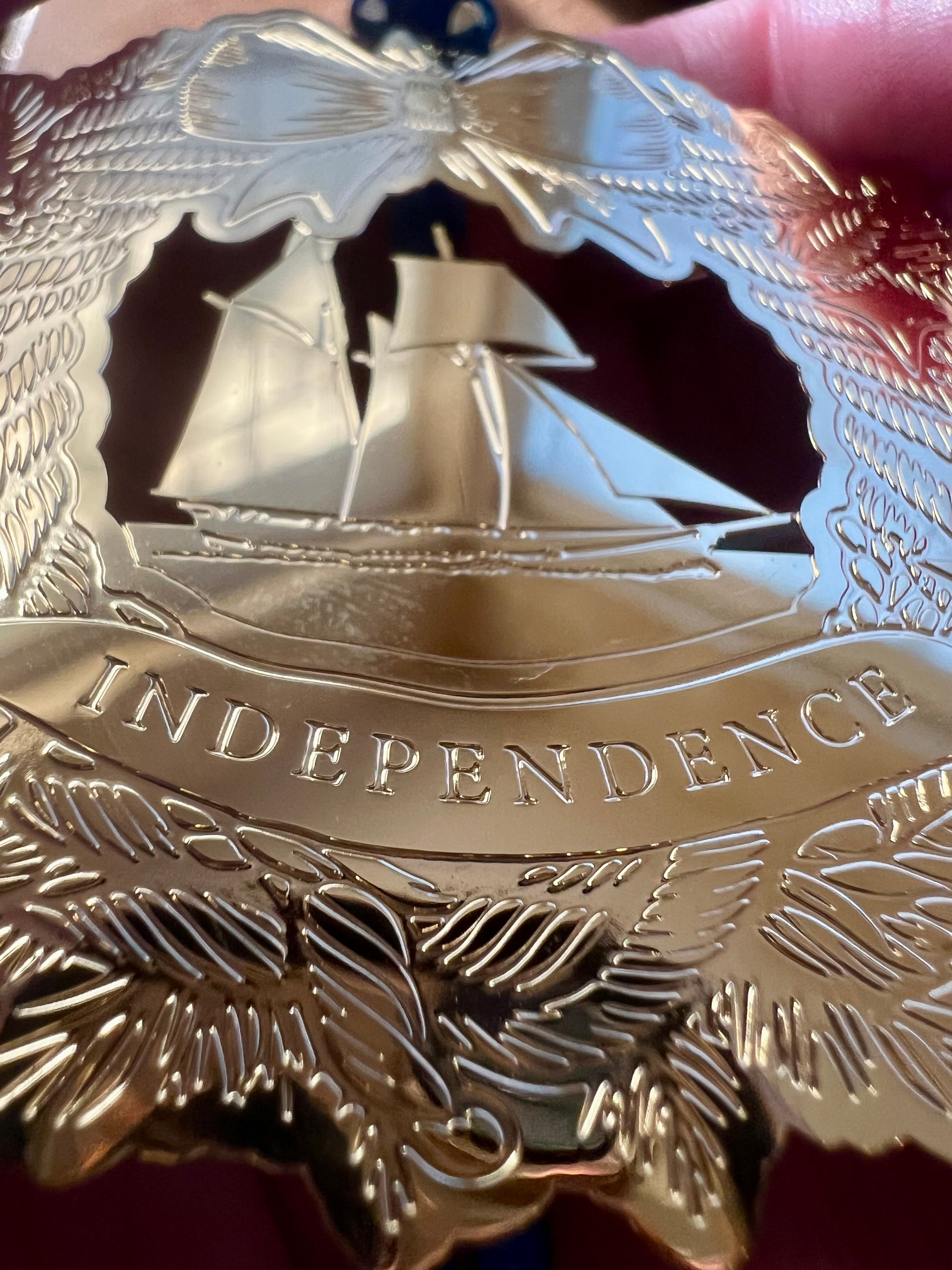 Each measures 2.5" wide by 2.5" tall. They're strung with a navy blue ribbon, ready to stand guard over the other decorations on your tree.